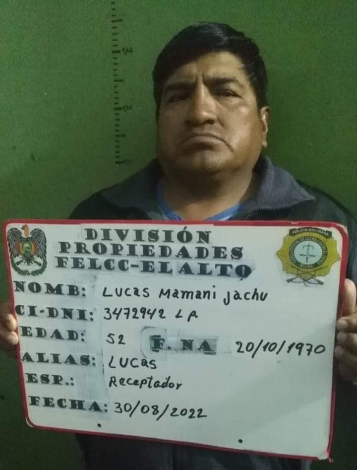 A horas 00:30 a.m. del 30 de agosto, tras acciones de vigilancia y seguimiento en un inmueble en la zona de Llojeta en el municipio de #LaPaz, se logró aprehender al señor Lucas Mamani Jachu, en su domicilio se encontraron varios objetos como televisores, pantallas, etc., presuntamente robados. El sujeto fue reconocido por las víctimas.