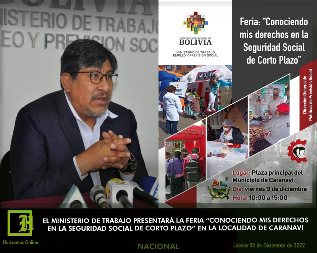 El Ministerio de Trabajo, Empleo y Previsión Social a través de la Dirección General de Políticas de Previsión Social, realizara el día de mañana viernes 09 de diciembre, de horas 10:00 am a 15:00 pm en la plaza principal del municipio de Caranavi la Feria “Conociendo mis Derechos en la Seguridad Social de Corto Plazo”