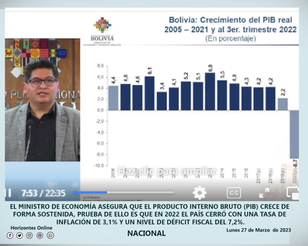 El ministro de Economía, Marcelo Montenegro, afirmó en conferencia de prensa que las políticas económicas aplicadas por el presidente Luis Arce Catacora para la reconstrucción de la economía rinden sus frutos puesto que el Producto Interno Bruto (PIB) crece de forma sostenida, baja los niveles de desempleo en el país, la inversión pública se incrementó de forma notable y se priorizó la salud de todos los bolivianos.