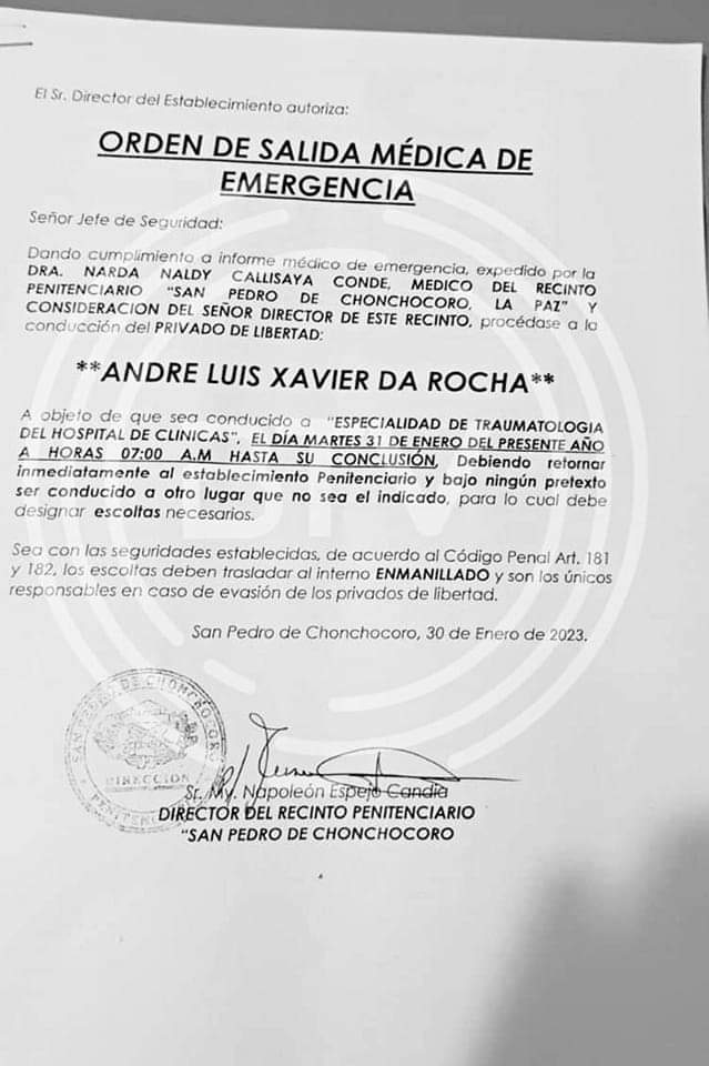 El ministro de gobierno anuncio la detención de la Dra Narda Callisaya por emitir el informe médico que permitió que el reo peligroso, Felipe Edvaldo Menezez Iglesias, que utiliza el nombre falso de Andrés Luis Xavier Da Rocha, acudiera de la cárcel de #Chonchocoro, la mañana de este martes, al Hospital de Clínicas de la ciudad de #LaPaz. Lugar de donde escapó asesinando a uno de sus custodios. La misma que señala que dando cumplimiento al informe médico de la doctora Narda Nardy Callisaya Conde, médico del recinto Penitenciario de #Chonchocoro y en consideración del Director del Recinto, se procede a la conducción del privado de libertad al Hospital de Clínicas y designar escoltas necesarios (dos policías), los escoltas deben trasladar al reo enmanillado, señala la orden de salida médica de emergencia.