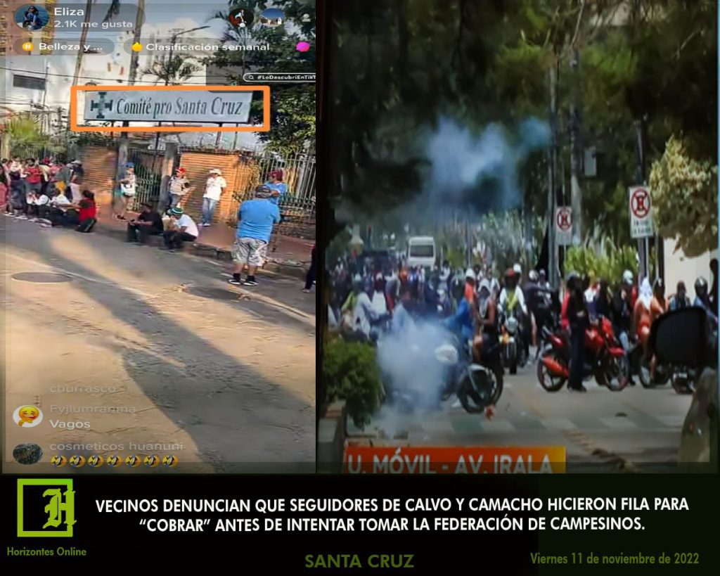 Circulan en redes sociales denuncias acerca de la fila que seguidores del comité cívico liderado por Rómulo Calvo y Luis Fernando Camacho realizaron en las puertas de esa institución según las denuncias son los mismo que luego buscaron tomar la federación de campesinos de Santa Cruz a la fuerza intento que fue subsumido por la policía nacional.